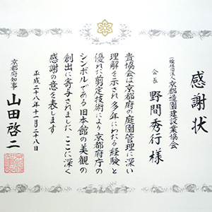 去る10月22日(土)に京都府庁で行った「剪定工事ボランティア」に対して、京都府より感謝状をいただきました。 11月28日(月)に、山田知事代理の志田総務部長よ…