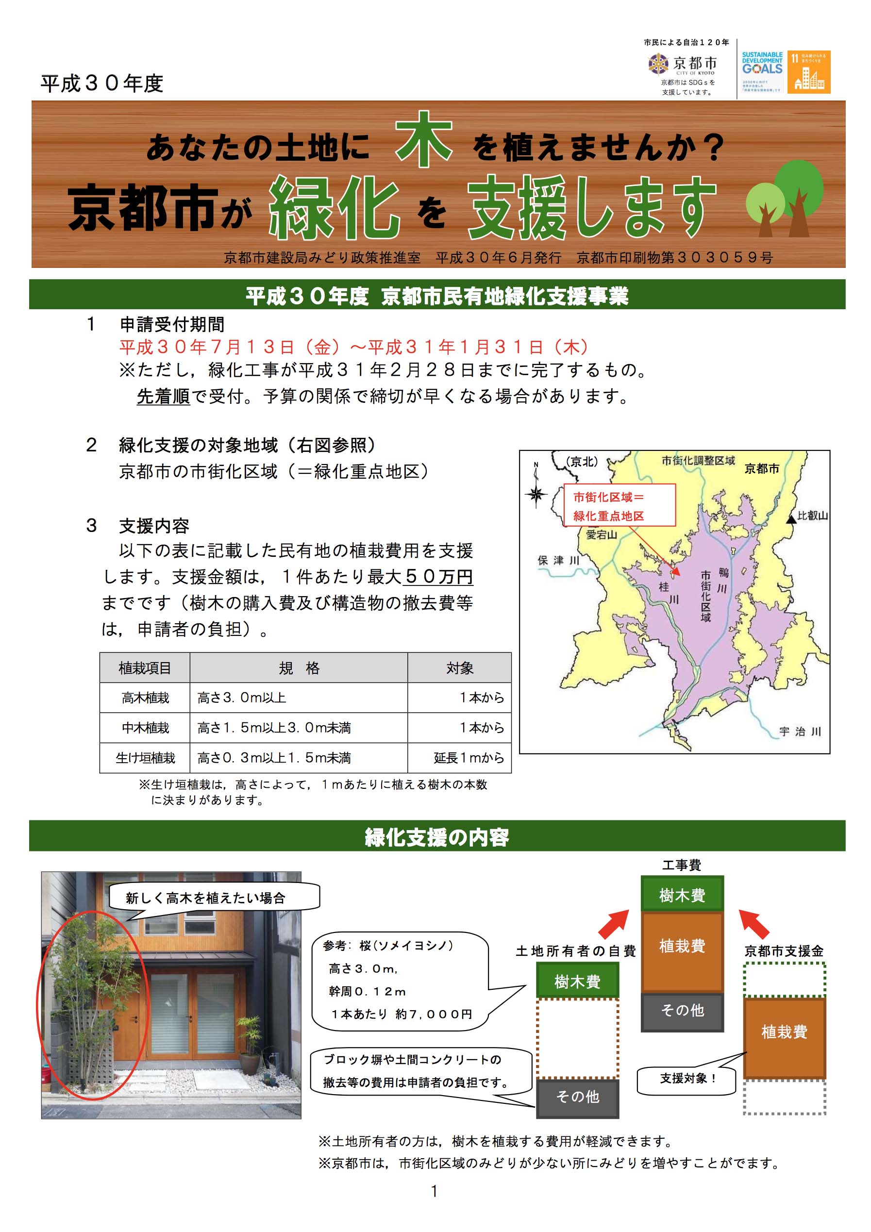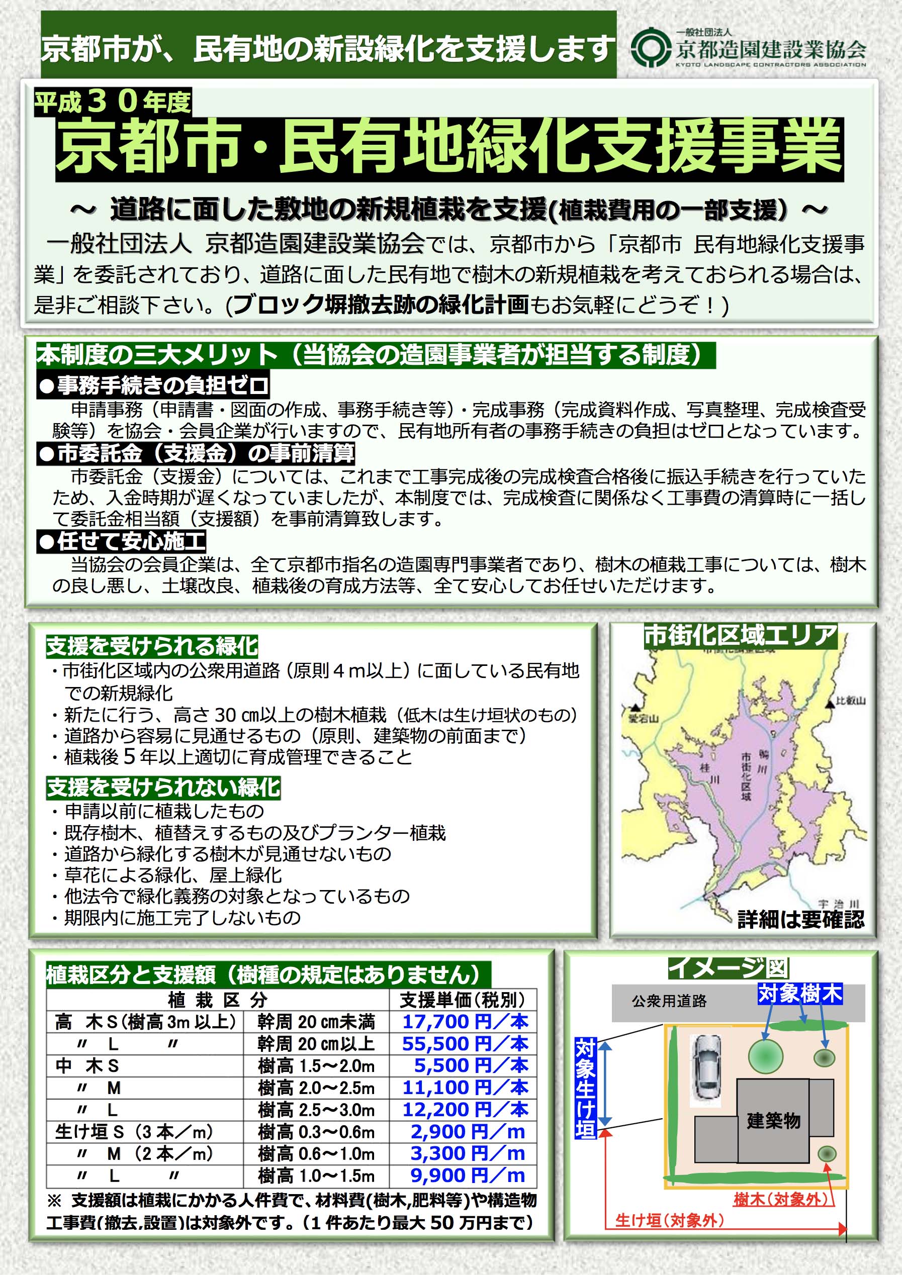 平成30年度 京都市民有地緑化支援事業 2018年8月29日 ニュース 「道路に面した民有地で樹木の新規植栽をされる場合は、京都市から支援が受けられます。 ブロック塀撤去跡の緑化にも支援が受けられます。 支援制度については、京都市から委託を受けている当協会が、緑化計画や申請手続き等についてアシストします。」 詳細はこちらをクリック 詳細はこちらをクリック 詳細はこちらをクリック 詳細はこちらをクリック Tweet