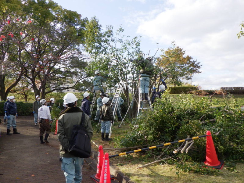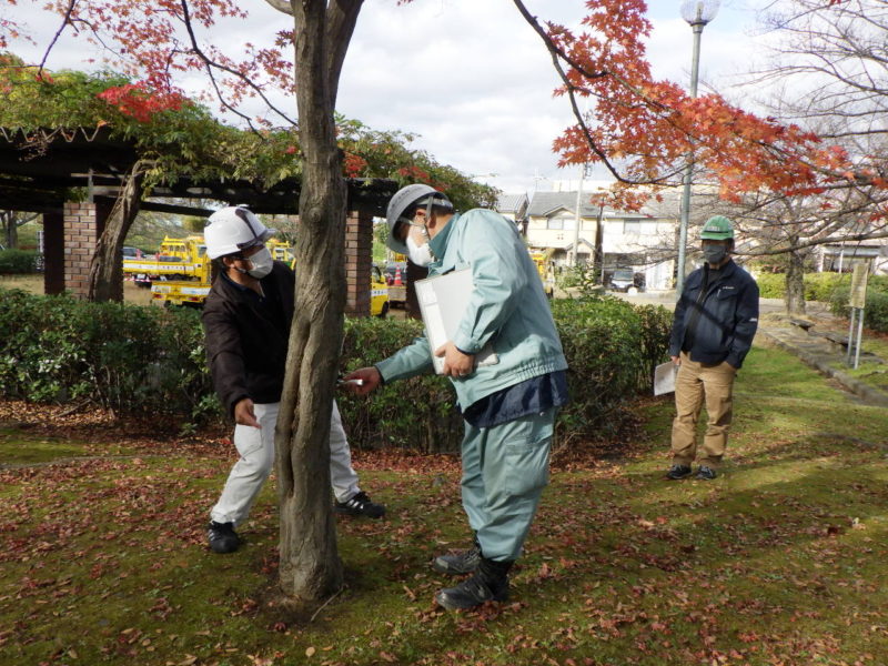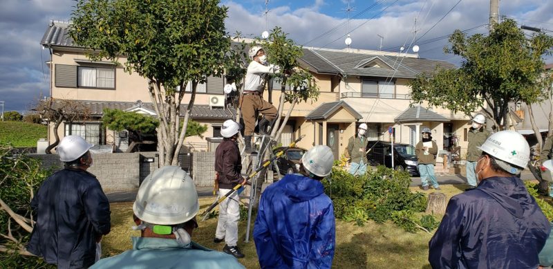 京都市建設局みどり政策推進室長様からご依頼頂きました、京都市の職員様に向けての「樹木の点検・剪定講習会」を、令和3年12月2日、南区東向公園にて開催致しました。