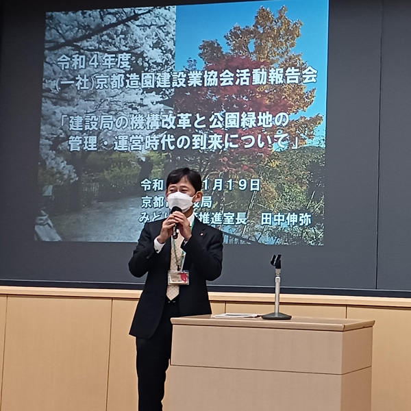 令和4年11月19日(土)、京都キャンパスにて今年度の活動報告会を実施しました。 今回の活動報告会は三部構成となっており、第一部は「京都市建設局の機構改革と公園…